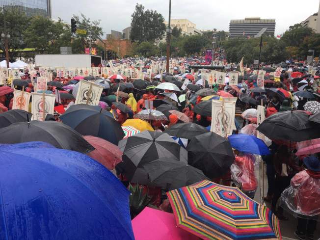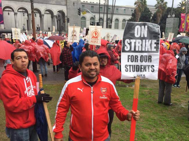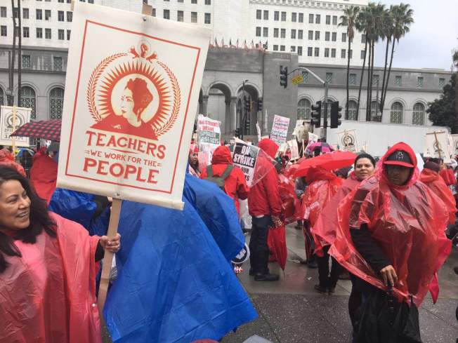 上午9時起,各地教師從四面八方湧向洛杉磯市中心大公園;約10時半,人潮增至少上萬人。教師們高舉「Kids First(孩子優先)」、「On Strike for our students(為我們的學生而罷工)」等各種標語;部分初、高中學生也加入遊行隊伍, 為教師們加油;遊行隊伍一路行進到洛杉磯聯合學區總部,沿途不斷獲得民衆鳴喇叭聲援。