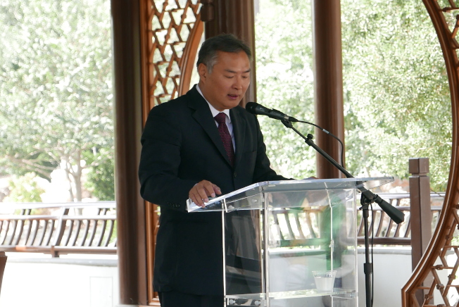 中國駐洛杉磯總領館總領事張平也出席儀式,表示幼時在蘇州生活,來到流芳園驚訝於在美國也有蘇州園林。他強調不同文化之間的和諧共處,表示相互了解是一個好的開始。中美兩個大國有很多可以互相學習的地方,流芳園也提供了一個平台,可以讓雙方民眾互相了解。