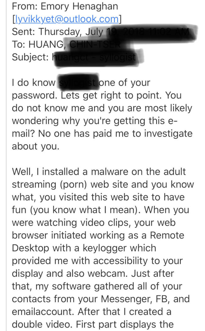 「我知道XX是你的密碼,直接說吧,你不認識我,也很困惑為何收到這個電郵?沒人付我錢要我調查你,不過,我在色情網站裝了惡意軟件,知道你曾瀏覽色情網站並快活過(你知道我指的是甚麼)。」