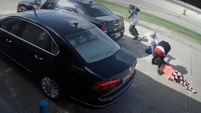 在德州哈里斯郡經營加油站兼超商的一名婦人,17日從銀行提款7萬5000美元之後,回到自家商店時卻遭兩名尾隨駕車跟蹤的男子(左一和右二)搶劫,不但遭到痛打,還被搶匪倒車從身上壓過(右下角躺在地上者),受到重傷。(哈里斯郡第四分局錄像截圖)