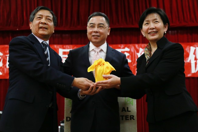 華盛頓中國和平統一促進會今年一月舉行換屆儀式,何曉慧(右)從前會長吳惠秋(左)接下會長職務,中國駐美大使館公使李克新出席見證交接。(本報檔案照)
