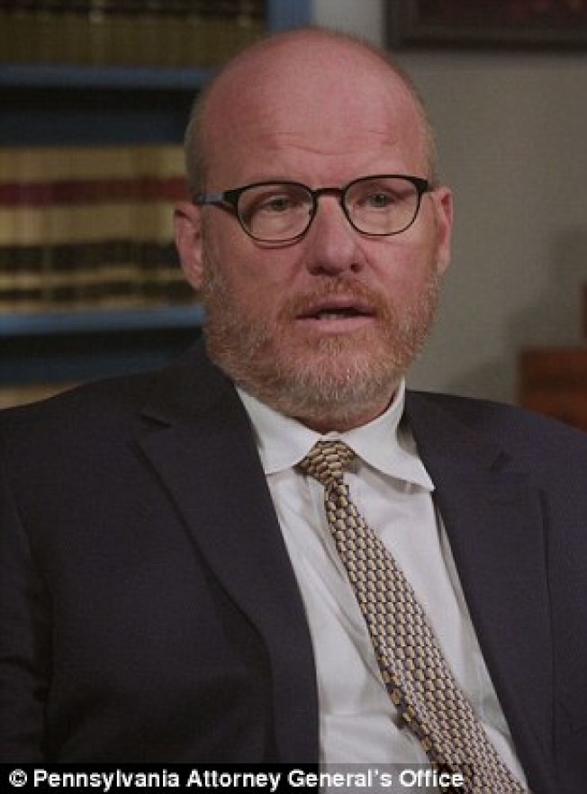賓州檢察長夏匹諾(中)14日在記者會上宣布大陪審團調查結果,天主教賓州教區有上千男孩女孩遭到神職人員性侵,作案時間長達70年,惡行更被教會高層掩飾包庇。(美聯社)