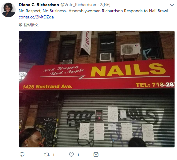 美甲店非洲裔顧客和華裔店家發生衝突事件發生後,選區涵蓋布萊特(Flatbush)的第43選區理查德森,一直力挺非洲裔顧客,8日上午發布名為「沒有尊重,沒有生意」(No Respect, No Business)的官方聲明。