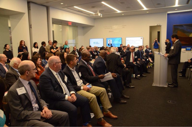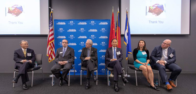 中美經貿論壇的參與嘉賓,左起中國大使館公參田德友、美國銀行投資經濟研究主任馬丁(Tim Martin)、北卡E4能源公司總裁達科特(David Doctor)、中國貿促會美國總代表趙振格、夏樂商會經濟發展副總裁蔡愛琳(Eileen Cai)、夏樂國際機場主任黒爾(Stuart Hair)。(Jason Paul提供)