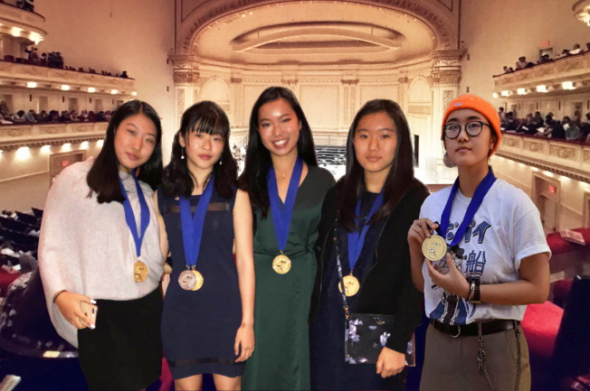 中佛州獲金鑰匙獎學生合影。左起方安琪、盧琳娜、陳愷林、Annika Yun(韓裔)及吳文煒。(范新林提供)
