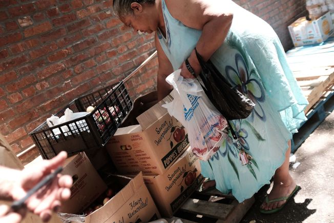 一名婦人在紐約布朗士一處免費食物庫翻找所需的食物。(Getty Images)