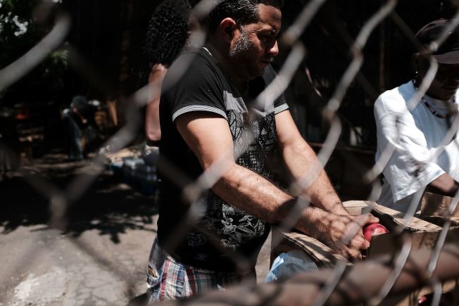 一名男士在紐約布朗士一處免費食物庫把食物裝入盒內。(Getty Images)