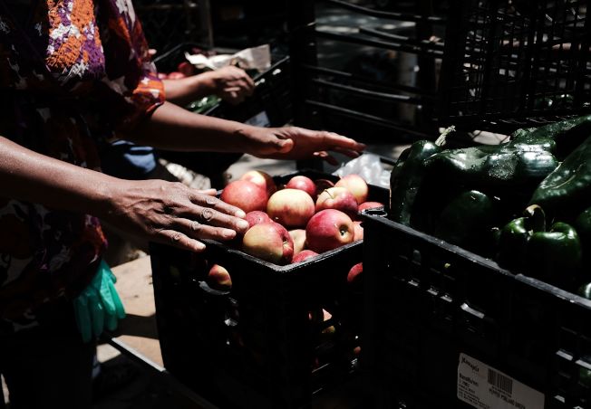 一名男士在紐約布朗士一處免費食物庫把蘋果裝入籃內。(Getty Images)