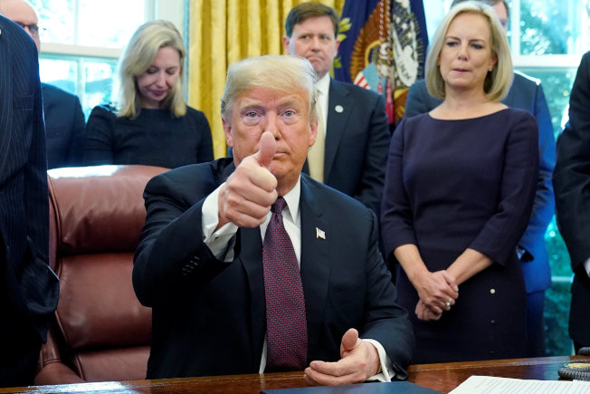 川普16日在白宮簽署網路安全和基礎設施安全法時,對記者比讚。(路透)