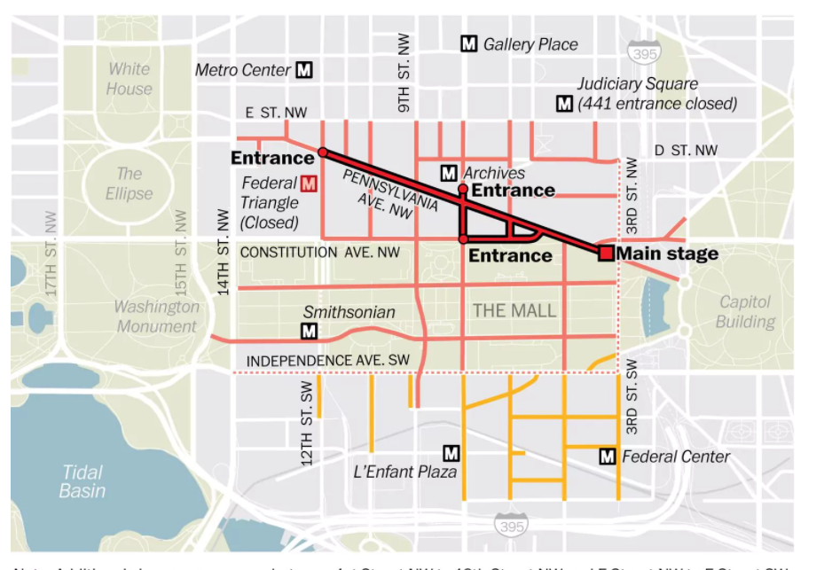 為了避免行程耽擱,華府地鐵局提醒乘客最好上網預購地鐵票,地鐵局將從上午7時起以平常日尖峰時段營運發車,集會期間,地鐵站聯邦三角站(Federal Triangle)關閉。