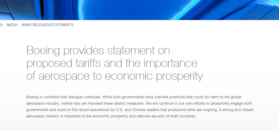 [环球网综合报道 记者 丁洁芸]针对美方无视中方交涉执意公布对华征税建议清单,中国商务部4日发布公告,宣布将对原产于美国的大豆等农产品、汽车、化工品、飞机等进口商品对等采取加征关税措施。有可能成为中美贸易战“牺牲品”的美国飞机制造商波音,5日在其官网发布一份有关“拟加征关税和航空航天对经济繁荣重要性”的声明,全文如下: