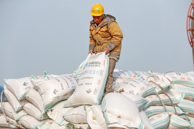 中國工人在江蘇南通港搬運袋裝大豆粕。(歐新社)