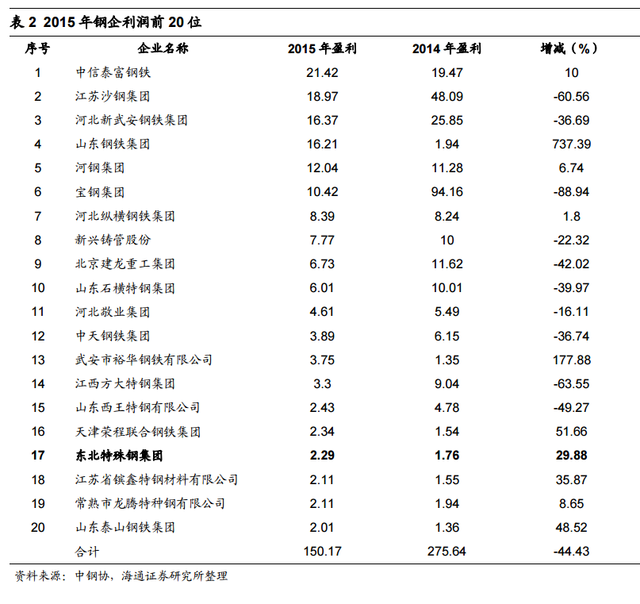 其次,该公司的经营并非难以为继,在行业不景气的情况下东北特钢依然在盈利。海通数据显示,2015年其盈利达2.29亿元,较2014年增长30%,在全国钢铁企业中列位17名。