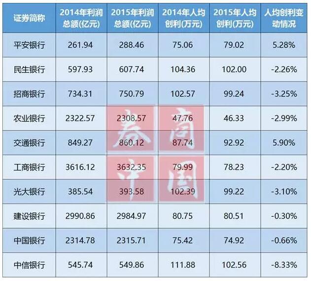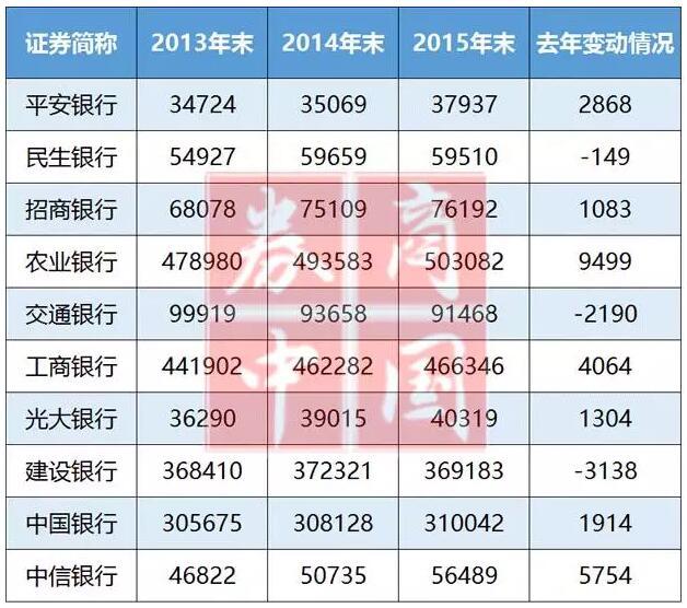 16家A股上市银行中,目前有2015年业绩可比数据的有10家银行,有工农中建交5家国有大行,招行、民生、中信、光大、平安5家股份制商业银行。此外,还有6家H股上市城商行、农商行发布业绩公告,但由于部分H股上市银行并未对员工人数予以披露,故并未纳入统计样本。