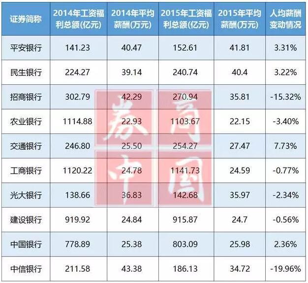 五大行方面,除交行及中行人均薪酬分别增长7.73%、2.36%外,其余三大行则有所减少,但减少幅度并不大。倒是招行及中信银行,人均薪酬降幅分别达15%、20%,但是这并非降薪导致,绩效薪酬的延期支付才是重要原因。