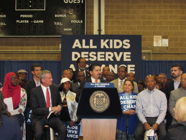 扬言改革纽约市特殊高中录取的市长白思豪(Bill de Blasio)3日在市教育总监卡兰扎(Richard Carranza)的陪同下,于布碌仑召开记者会,宣布将透过预留20%的录取名额给参加“探索”项目(Discovery Program)的学生,以及三年废除特殊高中入学测验(SHSAT)两种方式,将目前全市八所特殊高中仅占9%的非洲裔和西语裔学生提高到45%,实现每所初中前7%学生能获得特殊高中90%至95%的录取名额。而废除SHSAT的提案将于6日(周三)在州议会投票。