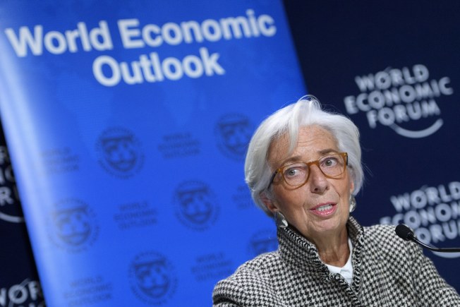 國際貨幣基金總裁拉賈德22日在達沃斯記者會上簡報世界經濟展望。(歐新社)