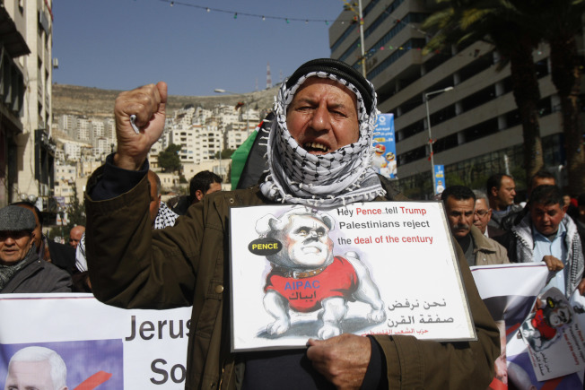約旦河西岸的巴勒斯坦人22日手持潘斯畫,在街頭抗議美館要遷到耶路撒冷。(美聯社)