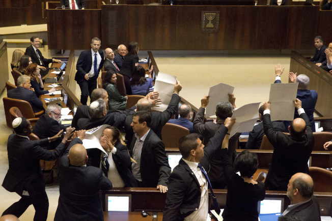 美國副總統潘斯22 日在以色列國會演講,宣布美使館遷移大事,引起議場內 阿拉伯裔的國會議員不滿,噓聲抗議,警衛被召入場維持秩序,鬧成一團。(美聯社)
