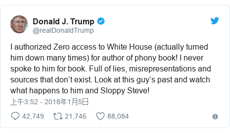 特朗普抨击这本书"虚假","充满了谎言",并称他没有授权沃尔夫进入白宫,也没有因这本书与沃尔夫谈话。