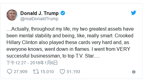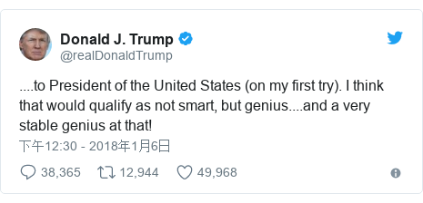 特朗普周六(1月6日)发送推特猛批民主党人和其它批评人士,并说,“......实际上,我这辈子的两个最大的财富是精神状况稳定,以及非常聪明。”“......对美国总统(我首届担任)。这认为这不仅证明的不是聪明,而是天才。......一位(精神状况)非常稳定的天才!”