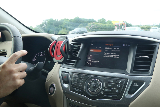 乔州免手持法允许驾驶人将手机连线到汽车或蓝芽设备上讲电话和收短信,有些车款会提示行车中因安全原因不显示短信内容。(记者张蕙燕/摄影)