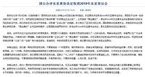 25日下午,国台办网站挂出的一则消息引起了很多人的注意。这则消息是国台办发言人安峰山针对2019年东亚青运会被取消一事进行的评论和回应。