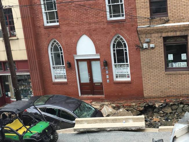 在老街擁有兩棟樓房的卡拉.布朗(Kara Brook Brown),洪災後拍下街對面教堂的慘況。(Kara Brook Brown臉書)