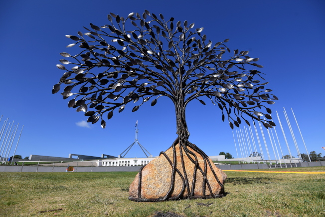 澳洲國會外矗立用鋼筋綑綁而成的樹,紀念慘遭性侵的兒童。(歐新社)