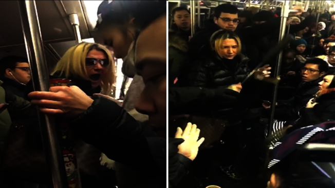 Anna Lushchinskaya(圖中金髮女子)在地鐵上攻擊一名華裔女子。(臉書截圖)