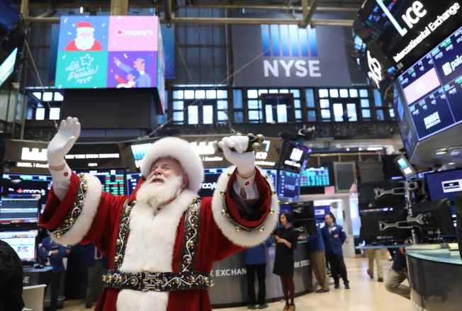 美國股市17日再次狂洩500點,多數金融界人士認為今年底前看不到「股市耶誕行情」。圖為耶誕老人11月到紐約證交所帶來歡樂。(路透)