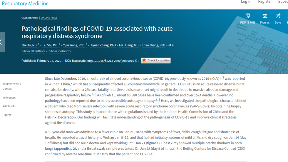 中国军队302医院对一名新冠病毒肺炎死者的解刨报告2月18日在著名医学杂志柳叶刀发表。这个世界首例新冠病毒肺炎病理解剖结果报告是由中科院院士,302医院传染病诊疗研究中心主任王福生等18人撰写。报告的结论建议及时适当使用糖皮质激素及呼吸机支持重症患者。