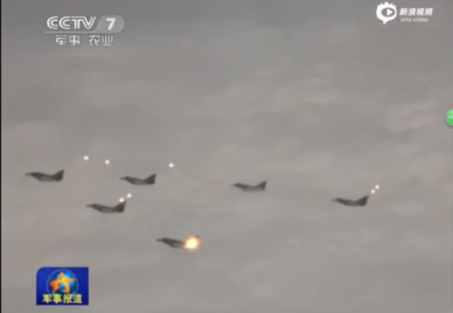 海航部队歼10战机6机编队空中齐射诱饵弹