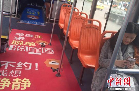 车厢内被分成了“颜值区”、“高冷区”、“脱单区”、“恩爱区”,在每个椅背后还印上了“单身汪求脱单”、“你不要担心,我不是什么坏人”、“我是女生”、“黑凤梨来,么么哒”等很逗趣诙谐的语句。