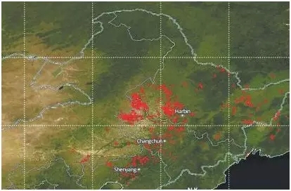 11月2日、3日,长春遭遇严重雾霾天气,这是2日东北平原秸秆燃烧火点分布情况(图片来自新文化报,中科院东北地理所副研究员陈卫卫供图)