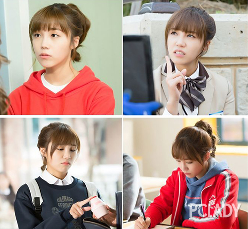 郑恩地为了更好地诠释高中生这一角色尝试了各种造型,高扎的灯笼麻花辫,将女学生活泼可爱的一面演绎地淋漓尽致。