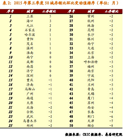 从排行中可以看出,存销比季度增加比较明显的10个城市为三亚(5)、海口(3)、九江(2)、石家庄(2)、哈尔滨(1)、贵阳(1)、茂名(1)、温州(1)、淮南(0)、南宁(0)。而减少比较明显的10个城市为烟台(-8)、天津(-7)、荆门(-6)、长春(-4)、西安(-4)、苏州(-4)、厦门(-4)、无锡(-3)、青岛(-3)、兰州(-3)。其中,括号内数据的单位为“月”。