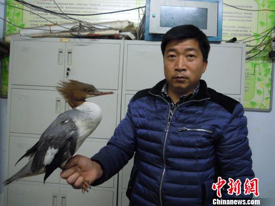 中新网三门峡1月7日电(师红垒 张鸿)一只嘴里还叼着一条小鱼的国家保护动物秋沙鸭近日落难河南三门峡宫前乡一村民家门口,万幸的是,这只“国宝”被村民王宏堂救起并被送往三门峡野生动物保护中心接受专业救治,待痊愈后将放归大自然。