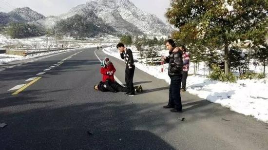 只见在一条马路中间,一个小伙子只穿着单薄的线衫,抖抖索索地站在冷风中,路边积雪未化,他身边有位老人倒在地上,身上盖着一件蓝黑色的外套。