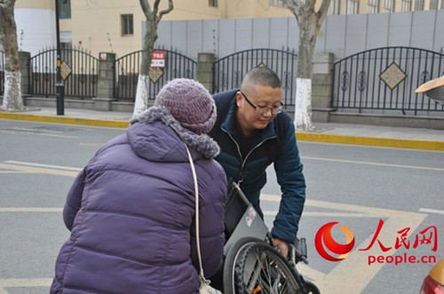 15:43,的哥蔡庆明从出租车上将卢桂富老人抱到事先准备好的轮椅上。