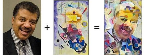 风格转换算法将照片与绘画风格相结合;例如天体物理学家奈尔•德葛拉司•泰森(Neil deGrasse Tyson)的照片与Kadinsky的《Jane Rouge Bleu》风格相结合。(摄影:Guillaume Piolle)
