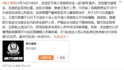 王某杰家属于14日下午组织十余人在平湖人民医院大厅内举横幅、烧纸钱,推搡殴打包括主治医生在内的多名医护人员,并强迫主治医生下跪烧纸钱。