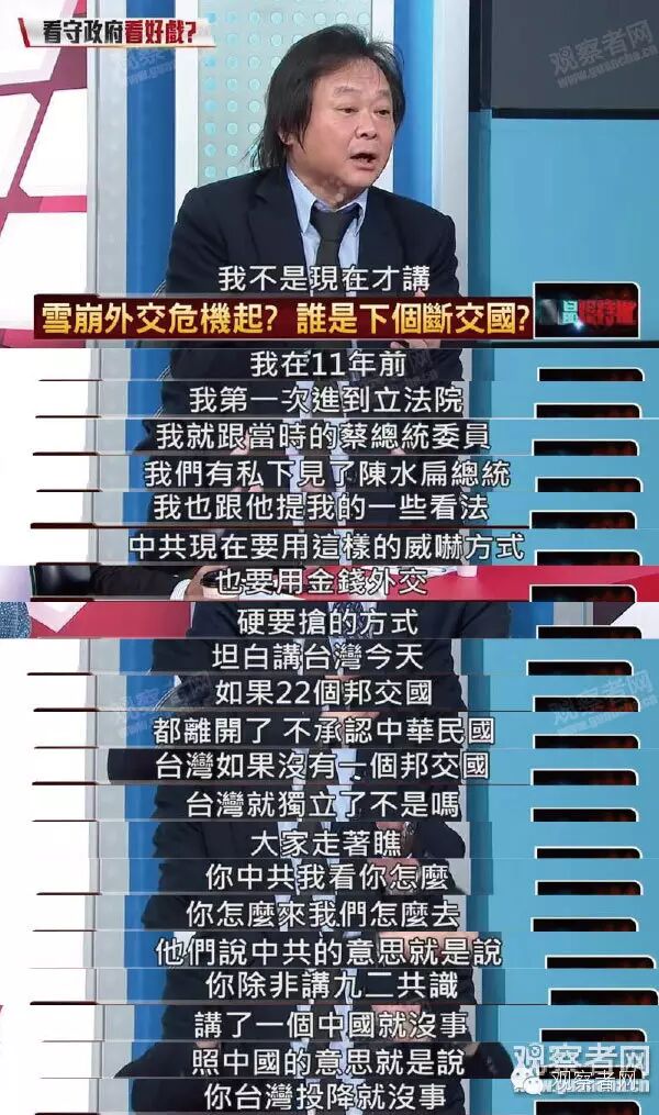 他表示如果这22个“邦交国”都离开了不承认所谓“中华民国”,台湾“如果没有一个邦交国”,台湾就“独立”啦!中共你能奈我何?