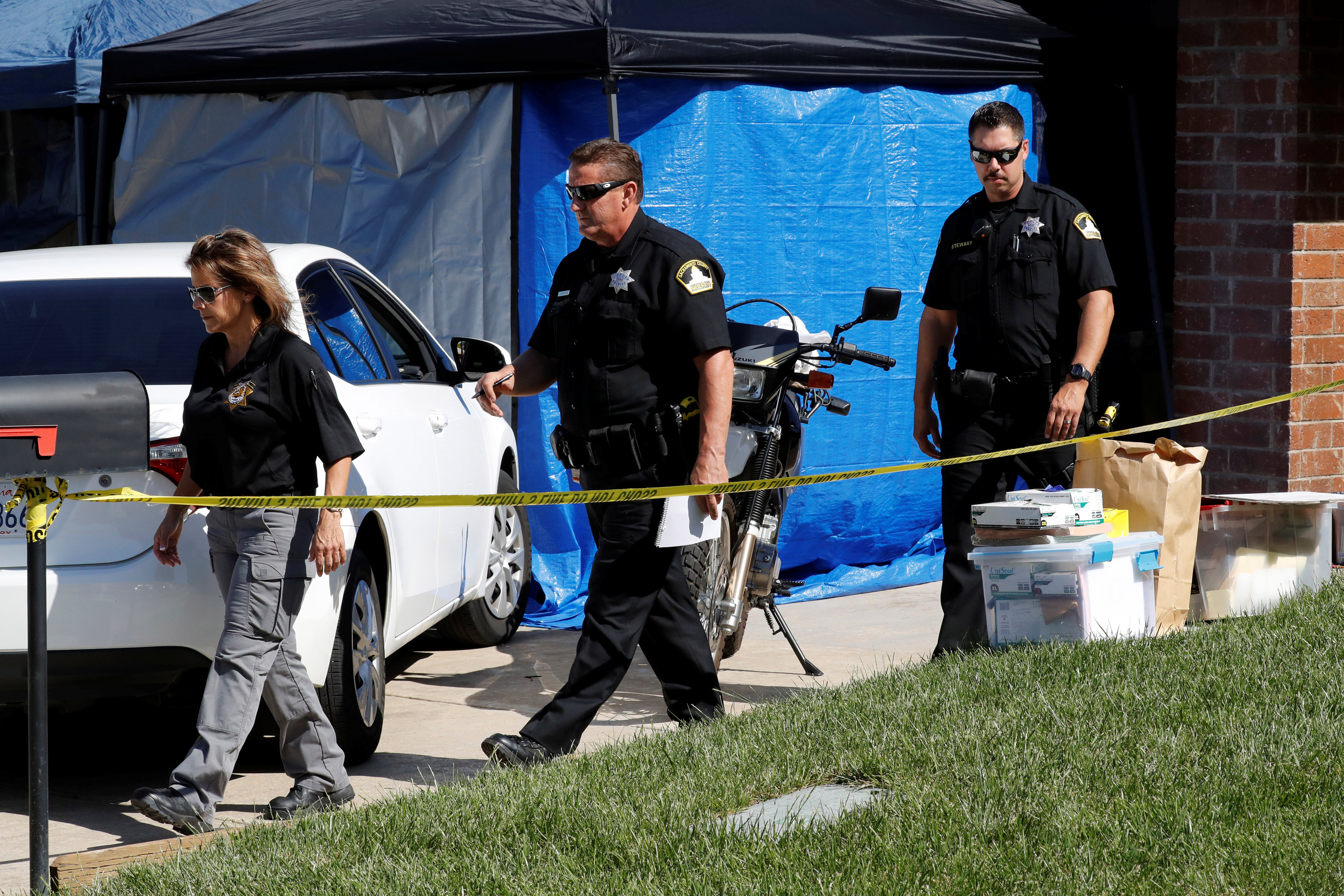 執法人員封鎖嫌犯狄安吉洛住處的車庫。(路透)