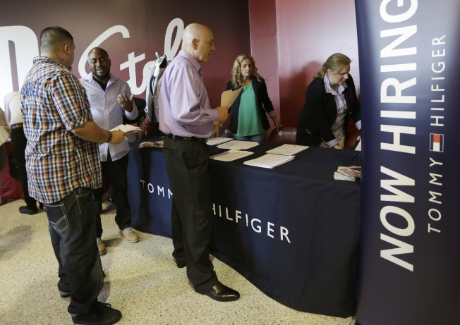 求職者在佛州就業博覽會排隊填寫申請工作。(美聯社)