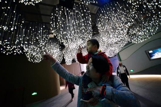 长廊一边,用木纸材质制成多层的中国生态景观——最里层是梯田和山丘,中间层是转动的水车,外层一只熊猫在竹林中戏耍。灯光从青绿转向橙黄,茂密的丛林里一只狮子出没其间,充满非洲草原特点的景观渐次呈现。游客们在这里拍照、留影,感受别样的“自然风光”。