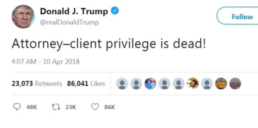 川普稍早曾經回擊,他不滿律師-客戶保密特權遭破壞;他發推文說「律師-客戶保密特權已死!」並說「這完全是獵巫」