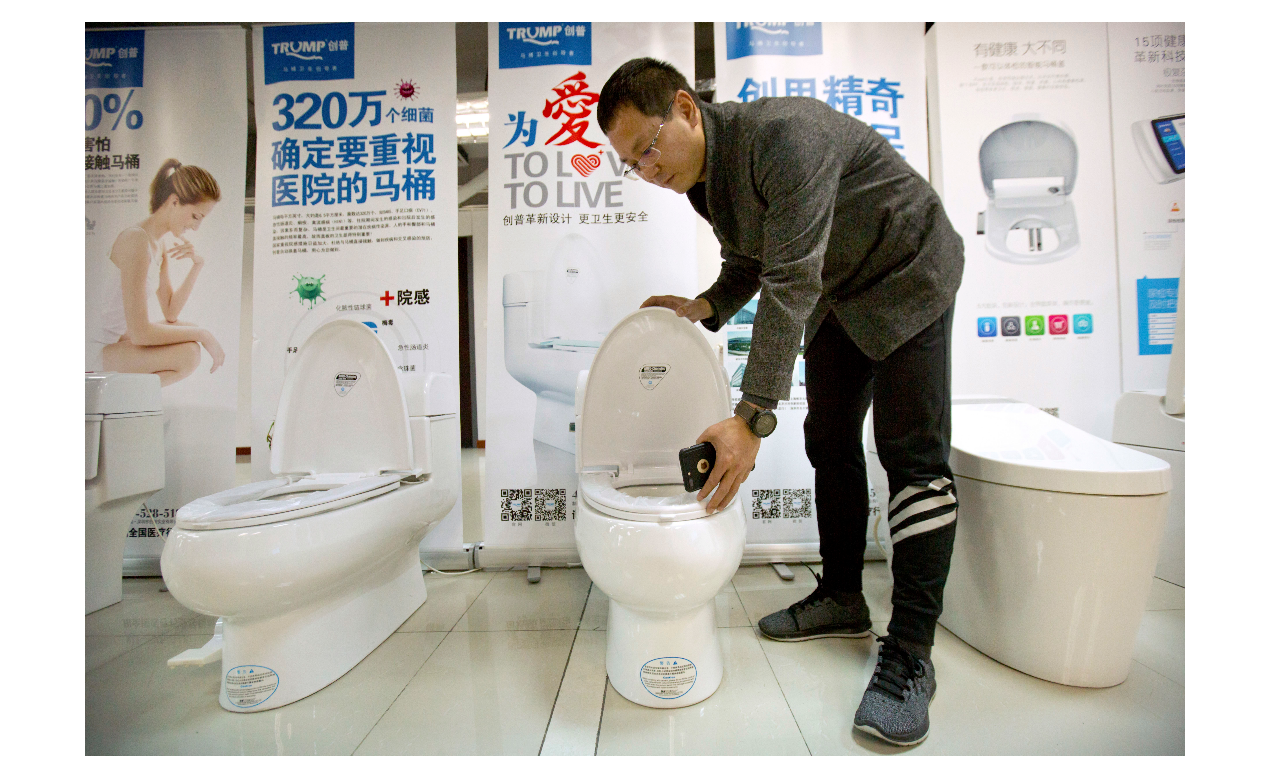 創普馬桶的鍾繼業介紹他公司產品。(美聯社)