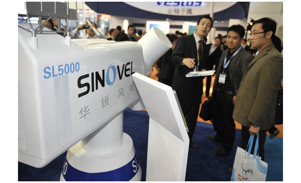 華銳風電遭美國超導公司控告技術剽竊。圖為技術人員向參觀者介紹華銳風電的5兆瓦風電機組模型。(新華社資料照片)