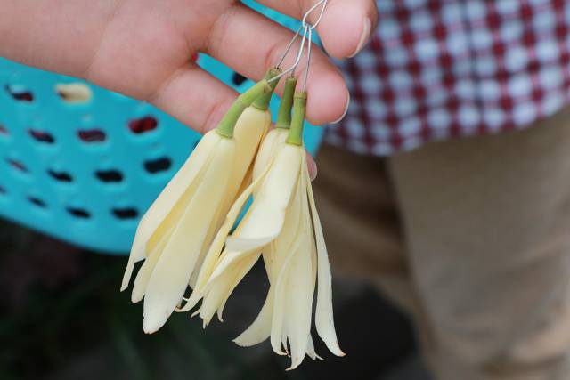 陈阿姨从篮子里拿出包裹在湿布里的白兰花,用一根铁丝,将花串起后用铁丝扭一扭,就是串“新鲜”的花。